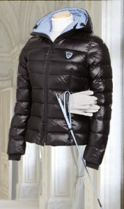 E' fornito di collo alto avvolgente con cappuccio inserito staccabile e regolabile ai lati e sulla nuca, zip anteriore YKK con doppio cursore, due tasche anteriori con zip a scomparsa, tasca interna, polsini interni in cannolè. Dall'elegante modello sciancrato in vita, è rifinito con fodera a contrasto e scudetto abbinati.