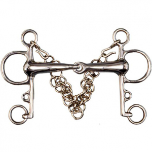 Pelham snodato vuoto, imboccatura 19 mm con barbozzale e ganci, aste 135 mm, in acciaio inox.