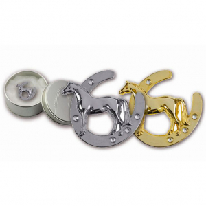 SPILLA A FERRO DI CAVALLO CON STRASS, PLACCATA IN ORO O ARGENTO.