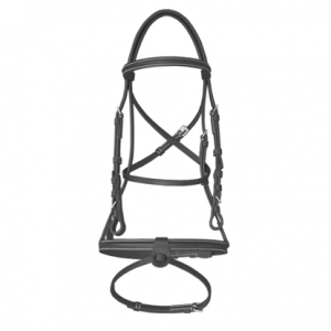 Testiera inglese in cuoio superiore, frontalino con cuciture bianche, completa di redini in gomma