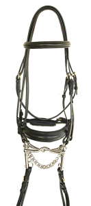 Testiera Daslo In cuoio, per morso e filetto con capezzina con doppia regolazione, imbottita in cuoio. Montanti con ganci, doppie redini lisce e fibbie in acciaio inox.